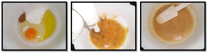Batir el huevo, la fructosa, el aceite de oliva, la vainilla y la canela hasta conseguir una textura cremosa.